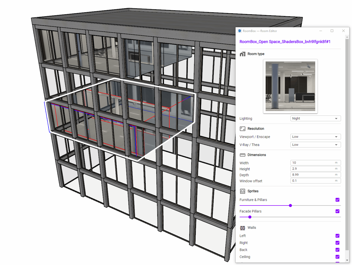 Move the cursor in the model to see a preview of where the room can be placed. When hovering vertical surfaces like windows, the room will automatically snap and align with the surface.